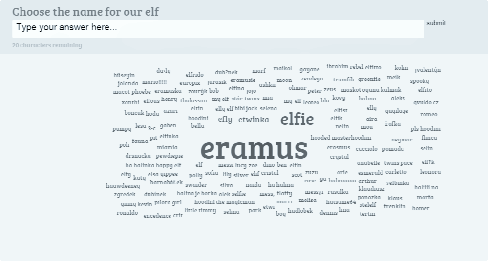 Poniżej znajdziecie tablicę, na której należy wpisać propozycję imienia, a następnie kliknąć w napis Submit. Jeśli nie macie ciekawego pomysłu, a podoba się Wam nazwa zgłoszona przez innego ucznia, kliknijcie w nią, a następnie potwierdźcie swój wybór klikając w Submit.