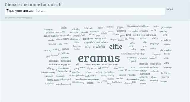Dziś ogłoszono wyniki głosowania na imię i płeć naszego elfa, maskotki projektu. Oddano aż 1554 głosy na imię, z czego 357 na Eramusa. I tak właśnie będzie nazywał sie nasz elf! Większość uczniów (246 spośród 420 biorących udział w ankiecie) zdecydowała, że nasza maskotka będzie chłopcem. Od jutra wszyscy partnerzy będą projektować swoje elfy. Każda ze szkół wybierze najciekawszą maskotkę, która będzie reprezentować kraj w międzynarodowym konkursie. Czyja praca okaże się najlepsza? Wkrótce się dowiemy...